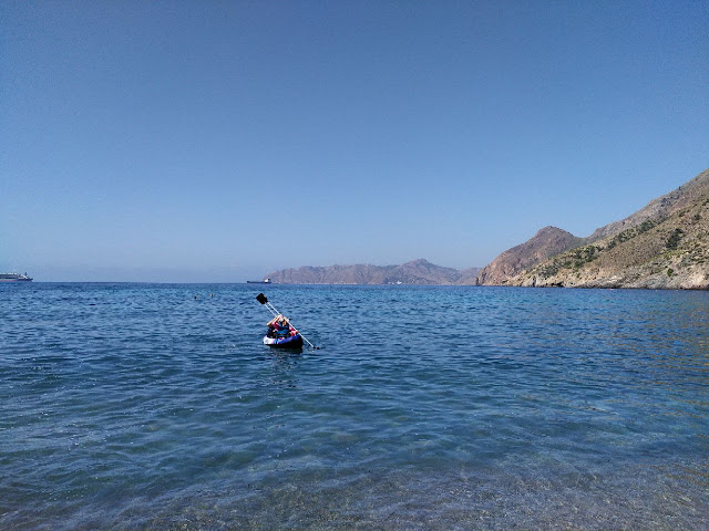 Pues lo dicho con las primeras luces estábamos preparando los kayak en esta ocasión llevábamos uno doble hinchable y otro individual rígido.Una vez todo preparado empezamos a remar, con un mar como una tabla de tranquilo. Dejamos la playa naturista a nuestra izquierda y seguiremos bordeando el acantilado para girar a la izquierda en oblicuo para dejar los kayak en tierra también los puedes dejar fondeados si lo sabes hacer👍 pero como el mar estaba super tranquilo los pudimos dejar fuera del agua sin problema.